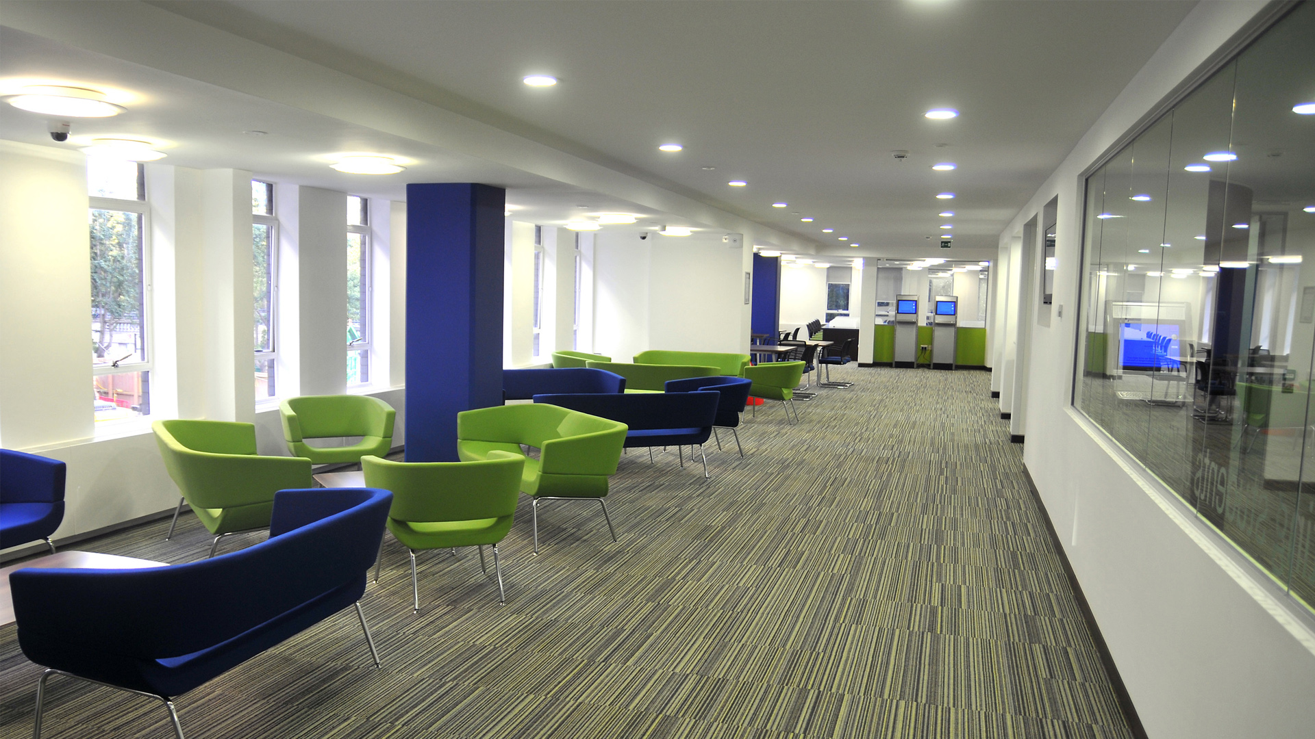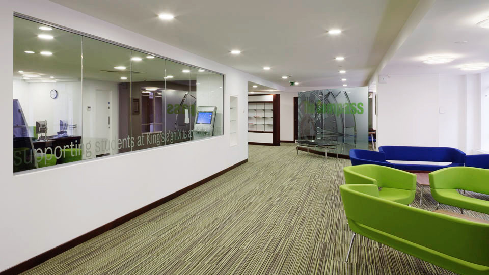 The design delivers a light, refreshing, and open feel which also offers areas of privacy where needed. The Compass is a division of Kings College’s Student Services, providing enquiries, payment facilities, and other assistance for the Strand Campus. Separate interview rooms are available for more private help and guidance, and quiet student study desks overlook the river embankment, beyond informal seating areas.