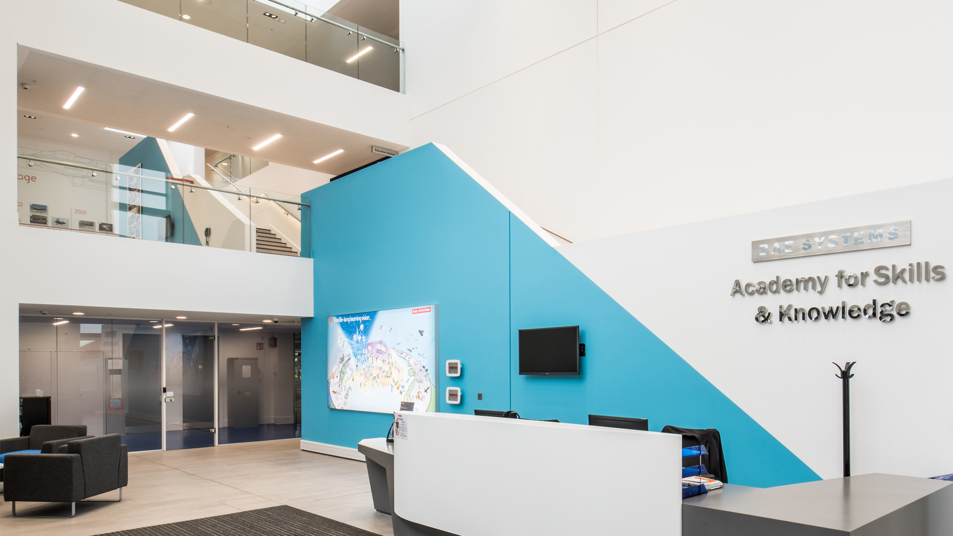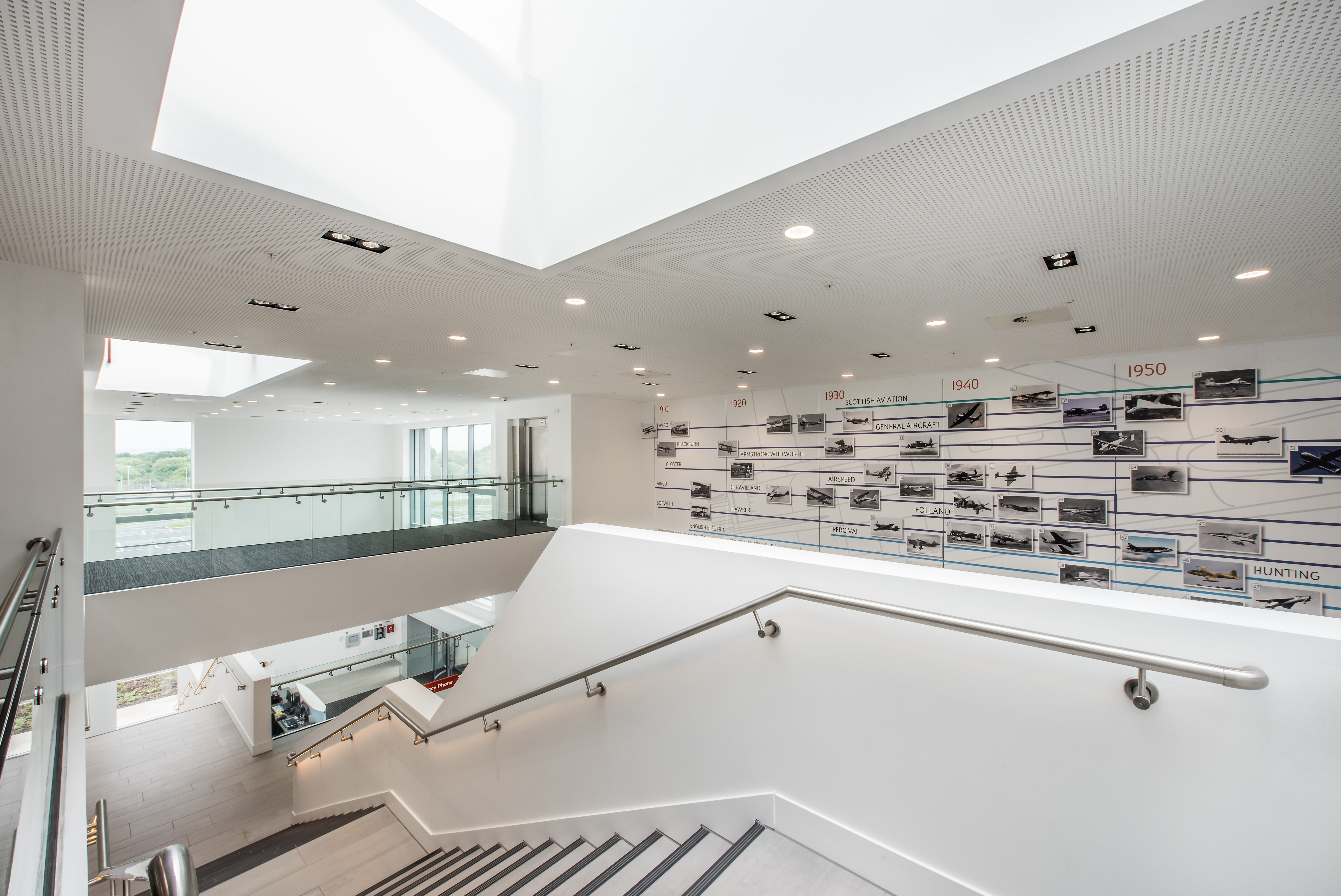 ASK has 26 light and airy classroom facilities and is designed to mirror the latest advanced manufacturing technologies and factory layouts; it also acts as a collaborative skills-hub for the North West’s engineering and manufacturing sector. The project provides offices and welfare facilities to support the management and occupation of the development which includes conferencing and exhibition spaces for hosting events and awareness programmes for schools. Workshop accommodation has been created to support fabrications, welding and fitting, carbon composite fabrication, machinery, and all avionics and industrial laboratory activities.