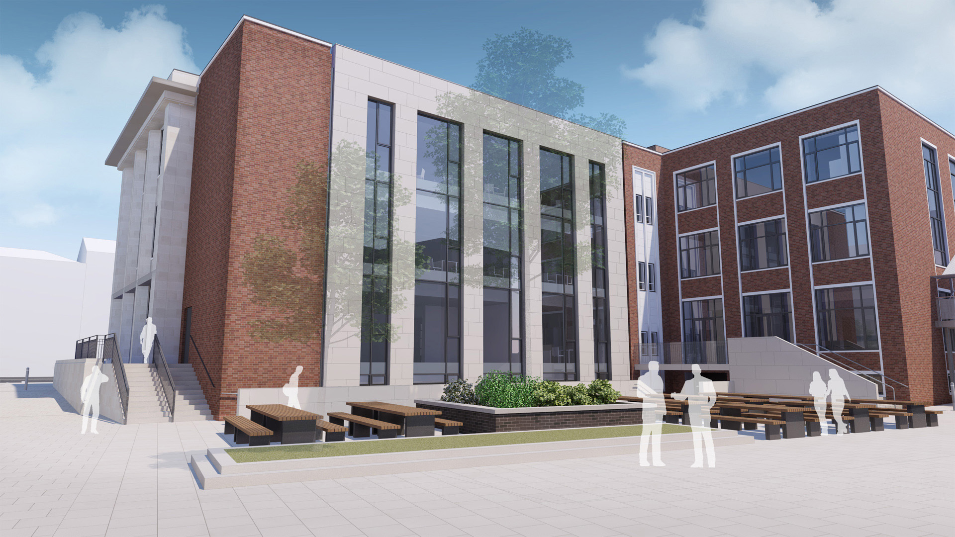 The designed exterior presents a contemporary take on the existing building. The current west elevation is simplified with a façade that uses a limited palette of materials. The use of bold forms reflects the rhythm of the existing building, and the introduction of a façade skin with deep window provides articulation to the elevation.